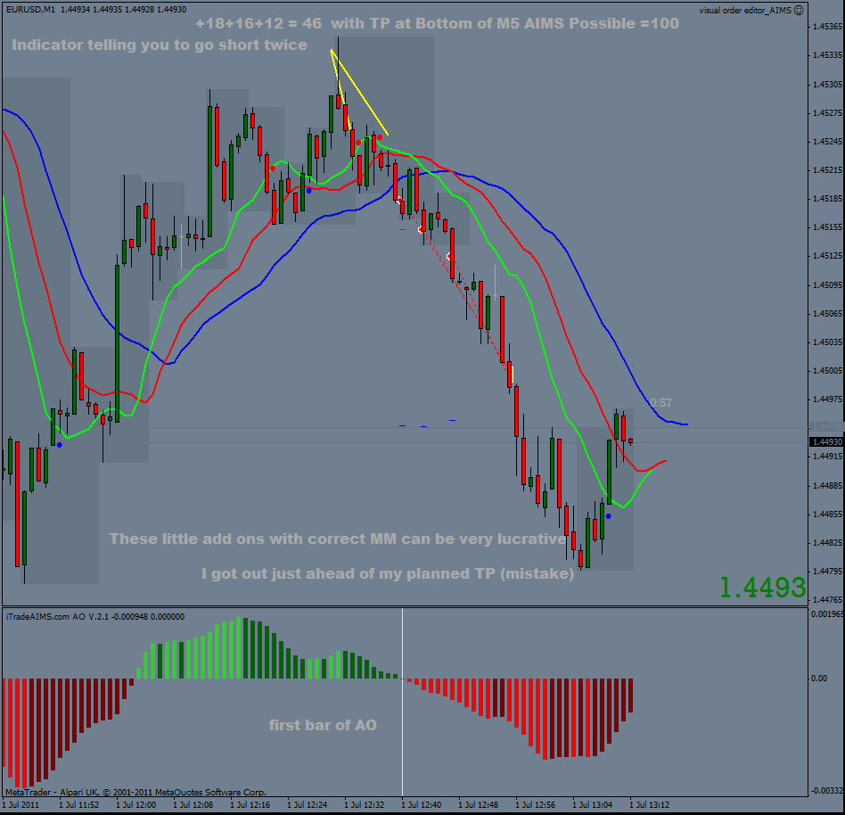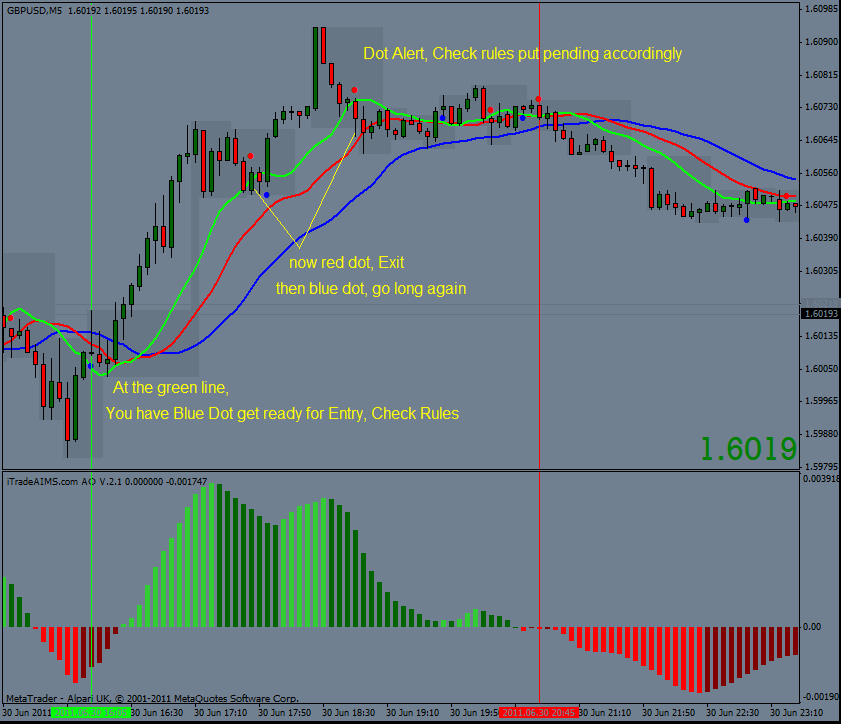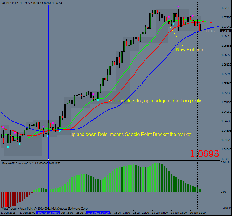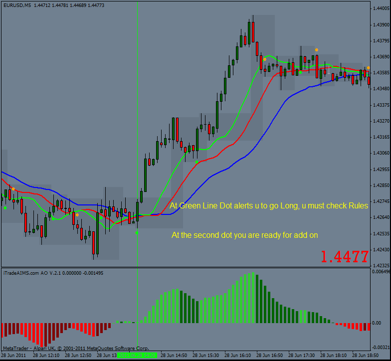 No thinking required no analysis just wait for indicator to alert you. But I warn you there is magic in it, but first you must understand the magic of using Alligator, AIMS Levels and iTradeAIMS AO. Once you know what those indicators can do for you, the alert will be a great help.